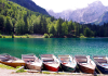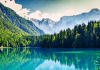 En pleno verano, excursionistas y turistas se concentran en las orillas de los lagos gemelos de Fusine, lo más famosos de Friuli, separados de un desnivel de apenas 5 metros. El permeable terreno calcáreo permite el filtrado de las aguas de un lago a otro, para después desaguar por el río del Lago.