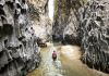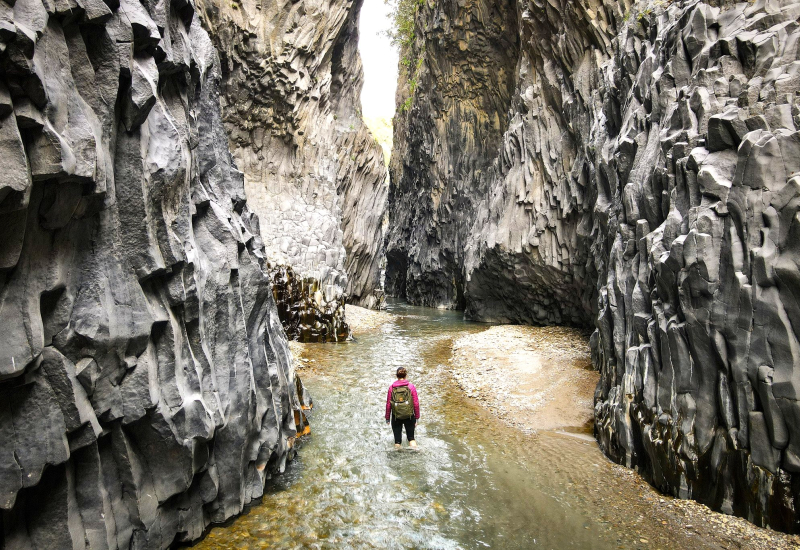 Camino de Milazzo nos detendremos en las famosas Gole di Alcantara, un profundo cañón que el río Alcantara ha labrado en formaciones basálticas procedentes del Etna. Una escalera de 250 peldaños permite el acceso al río (también hay un ascensor de pago), cuyas aguas en esta época del año pueden estar bastante frías. No obstante, aconsejamos llevar unas chanclas y bañador o pantalón corto para meterse en el lecho del río e introducirnos caminando al cañón.