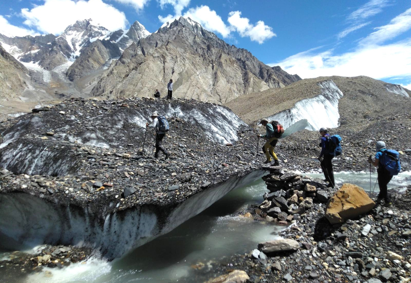 El trekking hasta este lugar, siguiendo el curso del rio Braldo, transcurre en una sucesión de paisajes abruptos con impresionantes glaciares y gigantescos y majestuosas montañas. Pese a lo salvaje del terreno y transcurrir por terreno glaciar, es un trekking de jornadas cómodas, donde se salvan desniveles asequibles y se aclimata muy bien.