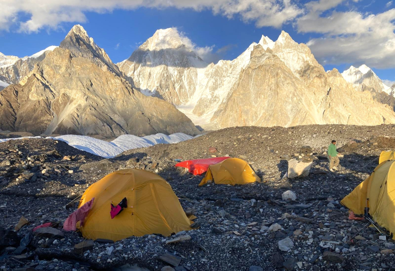 El terreno se vuelve cada vez más inhóspito y a nuestro alrededor reinan la roca y el hielo. Las grandes montañas hacen acto de presencia, como el Broad Peak, el primer ochomil. O la gigantesta y peligrosa pared del G-IV. Gasherbrum significa la "pared brillante" por su muy visible cara oeste, pero el nombre realmente proviene de "rgasha" (bonita) + "brum" (montaña) en idioma Balti, es decir "montaña bonita”.