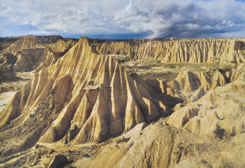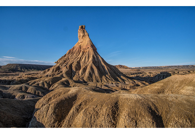 Profundos barrancos cambiantes, terrenos hundidos, cabezos corroídos por el agua y el viento, paredes blancas de acantilados cuarteados… este es el sugerente entorno de las Bardenas. Para entenderlo sólo debemos poner atención a los materiales del suelo, una alternancia de estratos sedimentarios de distinta dureza, como margas, calizas, yesos y arenas, provenientes de las cumbres pirenaicas y acumuladas aquí, en la depresión del Ebro. Toda esta materia prima sigue sufriendo hoy en día la meticulosa erosión que ha dado lugar a los peculiares cabezos o cerros testigos coronados por auténticas chimeneas, que por momentos nos recuerdan algunos paisajes de la Capadocia.