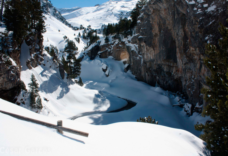 Hoy realizaremos una ruta por uno de los valles laterales de Benasque, el valle de Estós, sin lugar a dudas uno de los más bellos y puerta de entrada hacia el macizo del Posets que con 3.375 metros alcanza la segunda máxima altura de los Pirineos. Este valle cubierto de nieve constituye uno de los mejores lugares de la zona para progresar con nuestras raquetas.