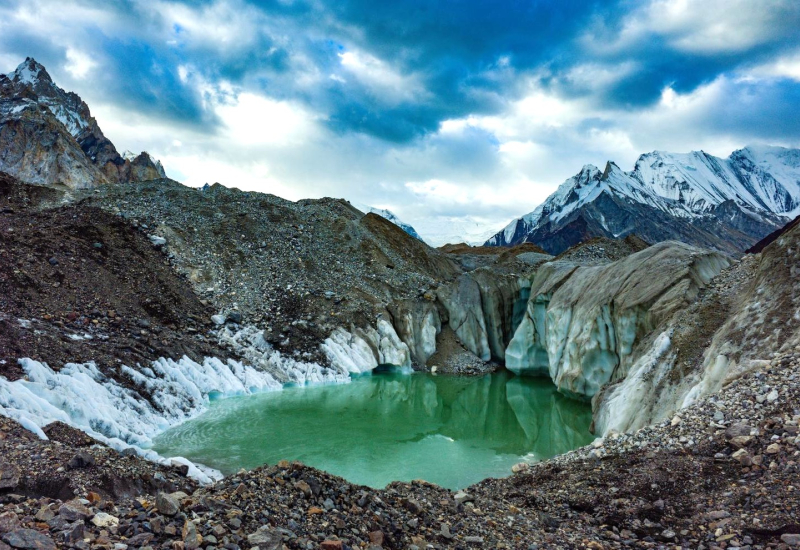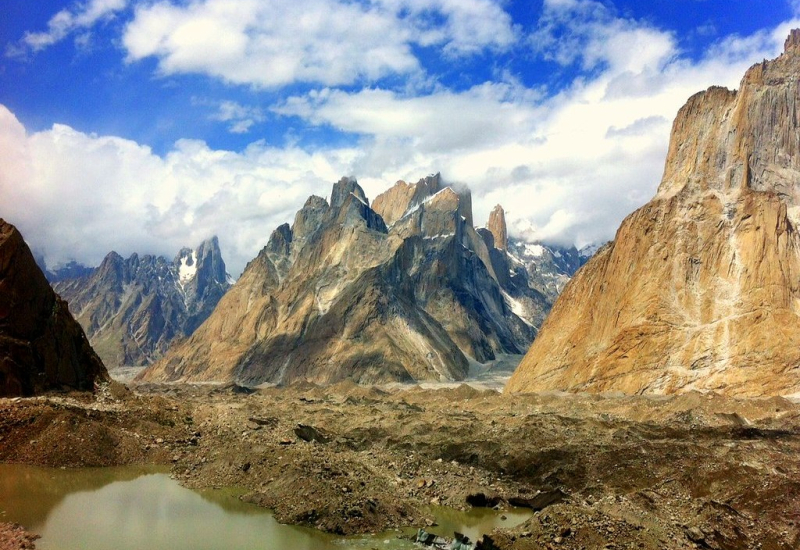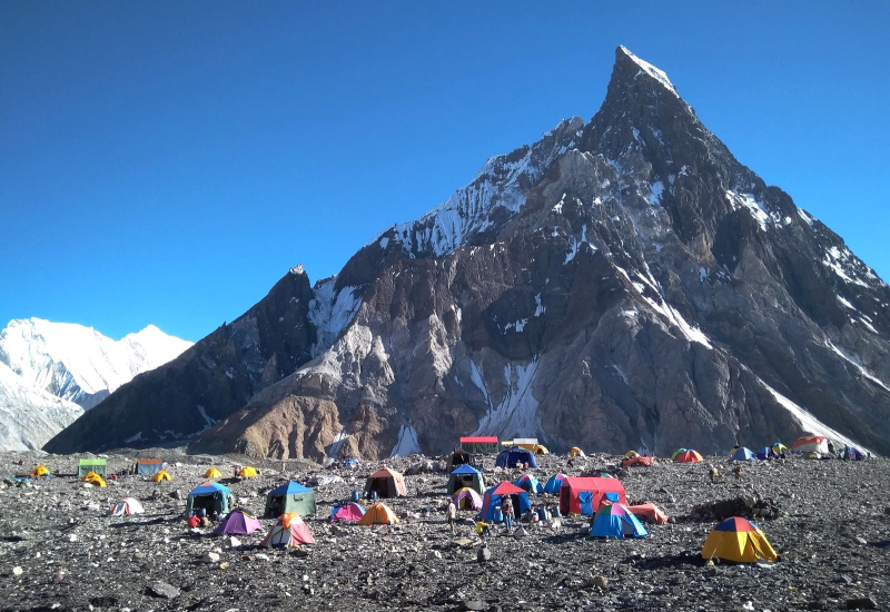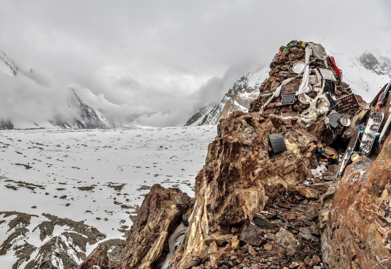 El trekking hasta este lugar, siguiendo el curso del rio Braldo, transcurre en una sucesión de paisajes abruptos con impresionantes glaciares y gigantescos y majestuosas montañas. Pese a lo salvaje del terreno y transcurrir por terreno glaciar, es un trekking de jornadas cómodas, donde se salvan desniveles asequibles y se aclimata muy bien.