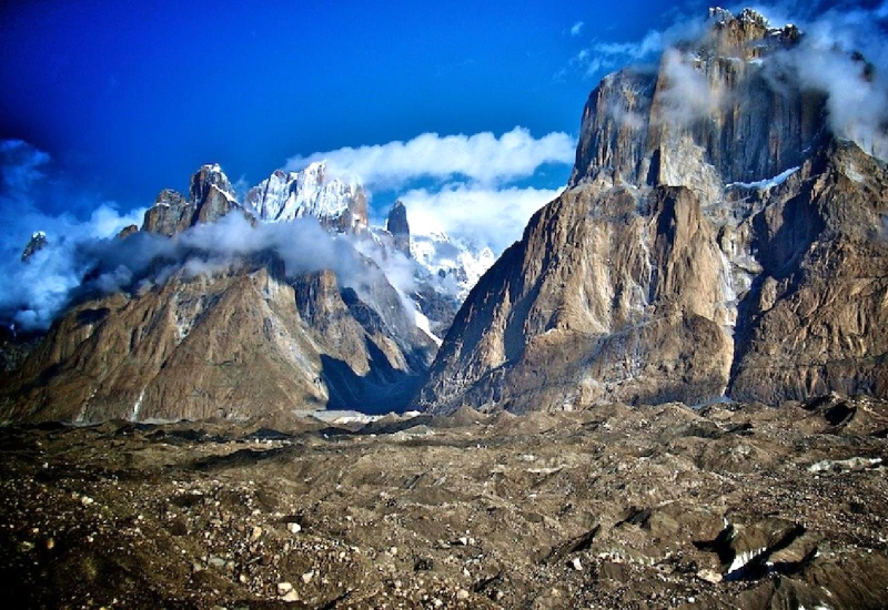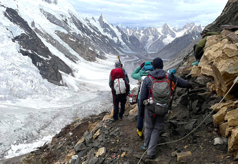 El terreno se vuelve cada vez más inhóspito y a nuestro alrededor reinan la roca y el hielo. Las grandes montañas hacen acto de presencia, como el Broad Peak, el primer ochomil. O la gigantesta y peligrosa pared del G-IV. Gasherbrum significa la "pared brillante" por su muy visible cara oeste, pero el nombre realmente proviene de "rgasha" (bonita) + "brum" (montaña) en idioma Balti, es decir "montaña bonita”.