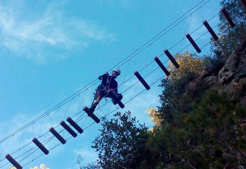 Continuamos la progresión en dificultad con la Falconera, actividad que complementaremos con prácticas de descenso en rápel, técnica que habremos de emplear en la ferrata de mañana.